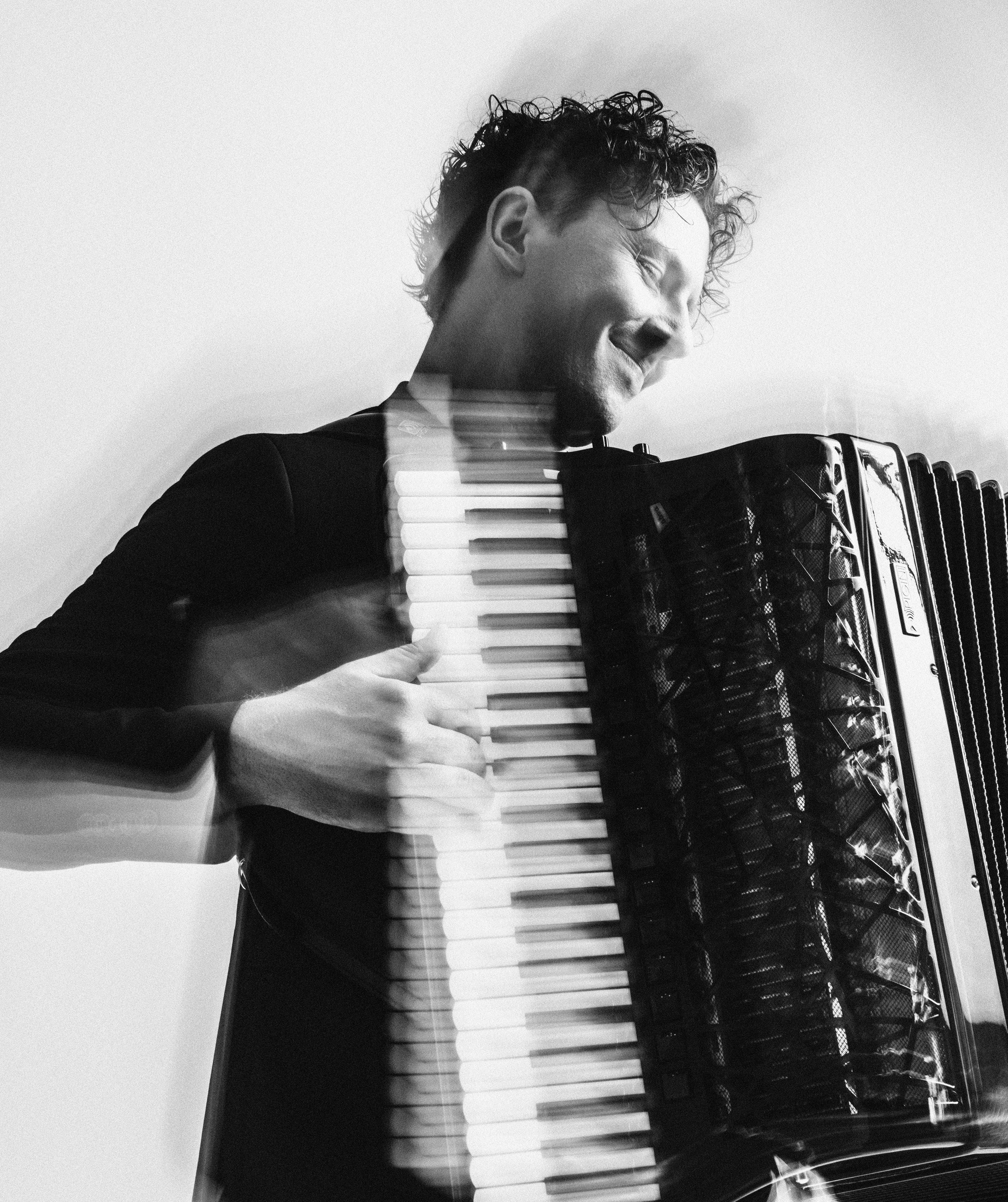 Internationally renown Accordionist Martynas Levickis photographed in August 2024. Photo & Creative Direction Sören L. Schirmer H&M Elina Gerschgorn Set Assistance Ana Mazaeva